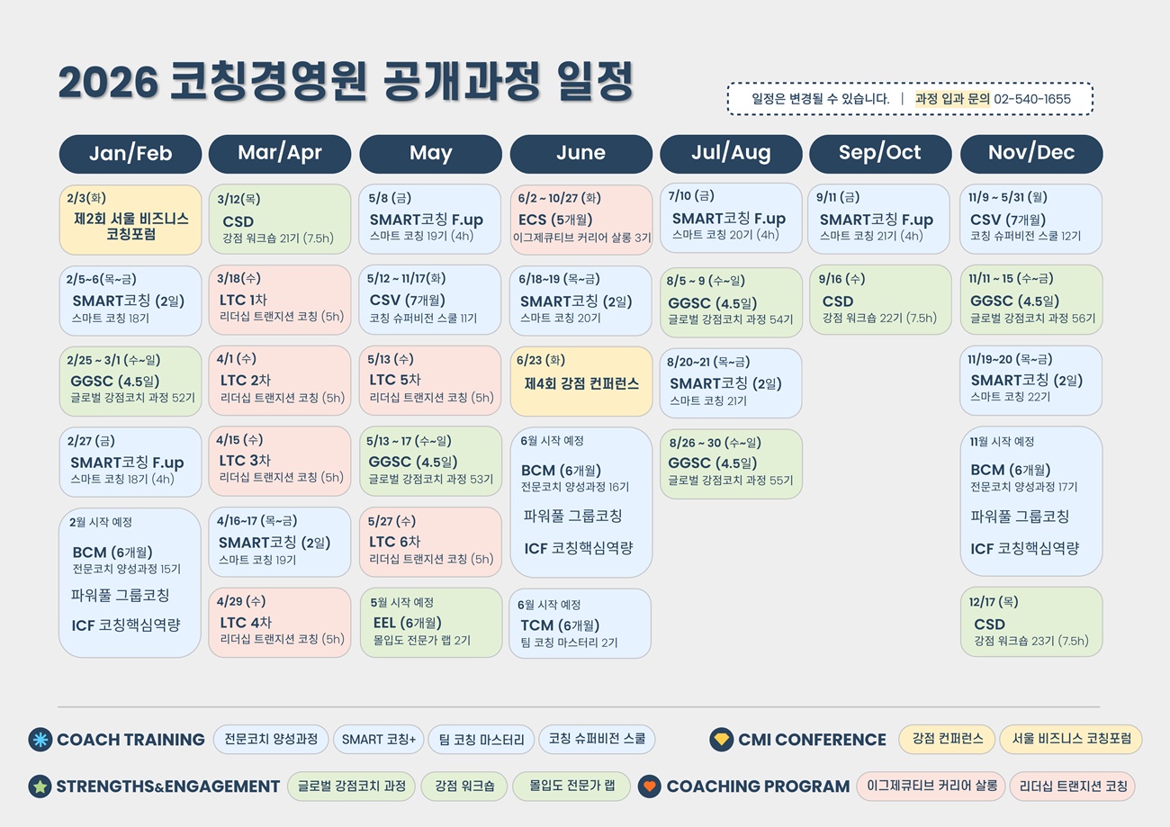 2026년 코칭경영원이 운영하는 공개과정 전체 일정을 공유 드리오니 많은 관심 부탁드립니다.
