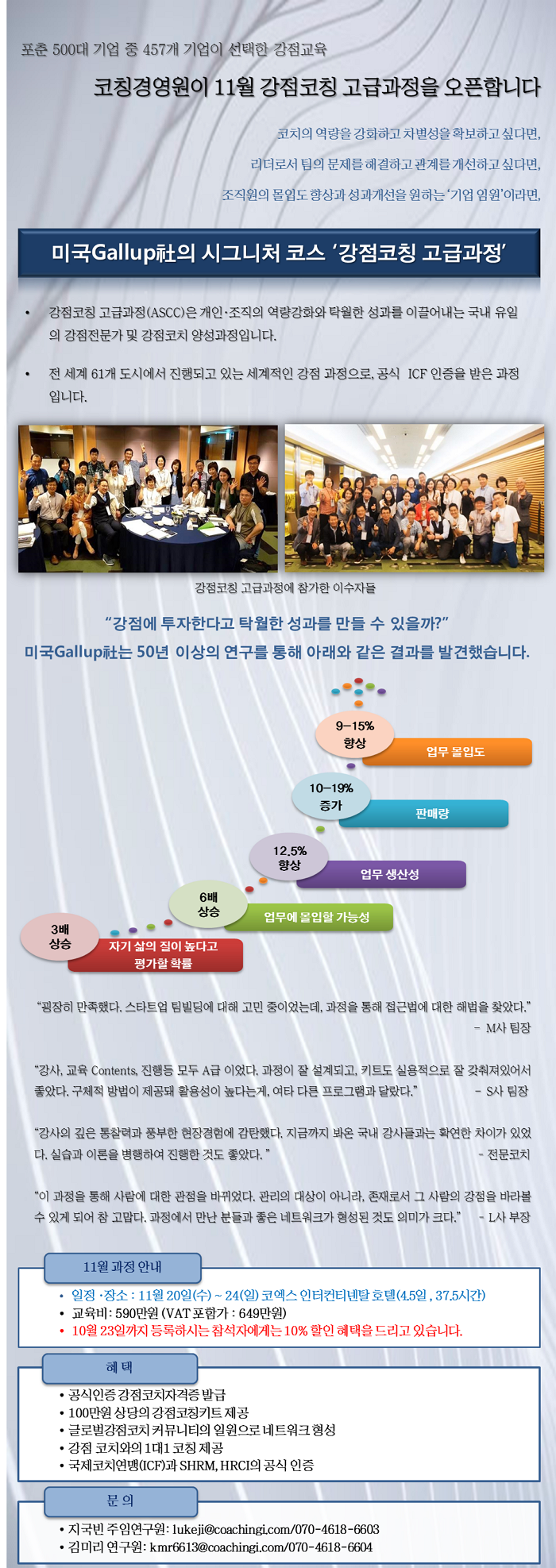 강점기반의 파워풀한 Coaching을 위한 강점코칭 고급과정(ASCC) 11월 과정이 오픈됩니다. 개인과 조직의 역량 강화로 탁월성을 이끌어내는 강점코칭 프로그램의 내용을 다음과 같이 안내드립니다. 목록 PREV 포춘 500대 기업이 선택한 강점교육! 코칭경영원이 시작합니다 NEXT 파워풀한 강점코칭, 코칭경영원 2020년 강점코칭 고급과정 일정 안내