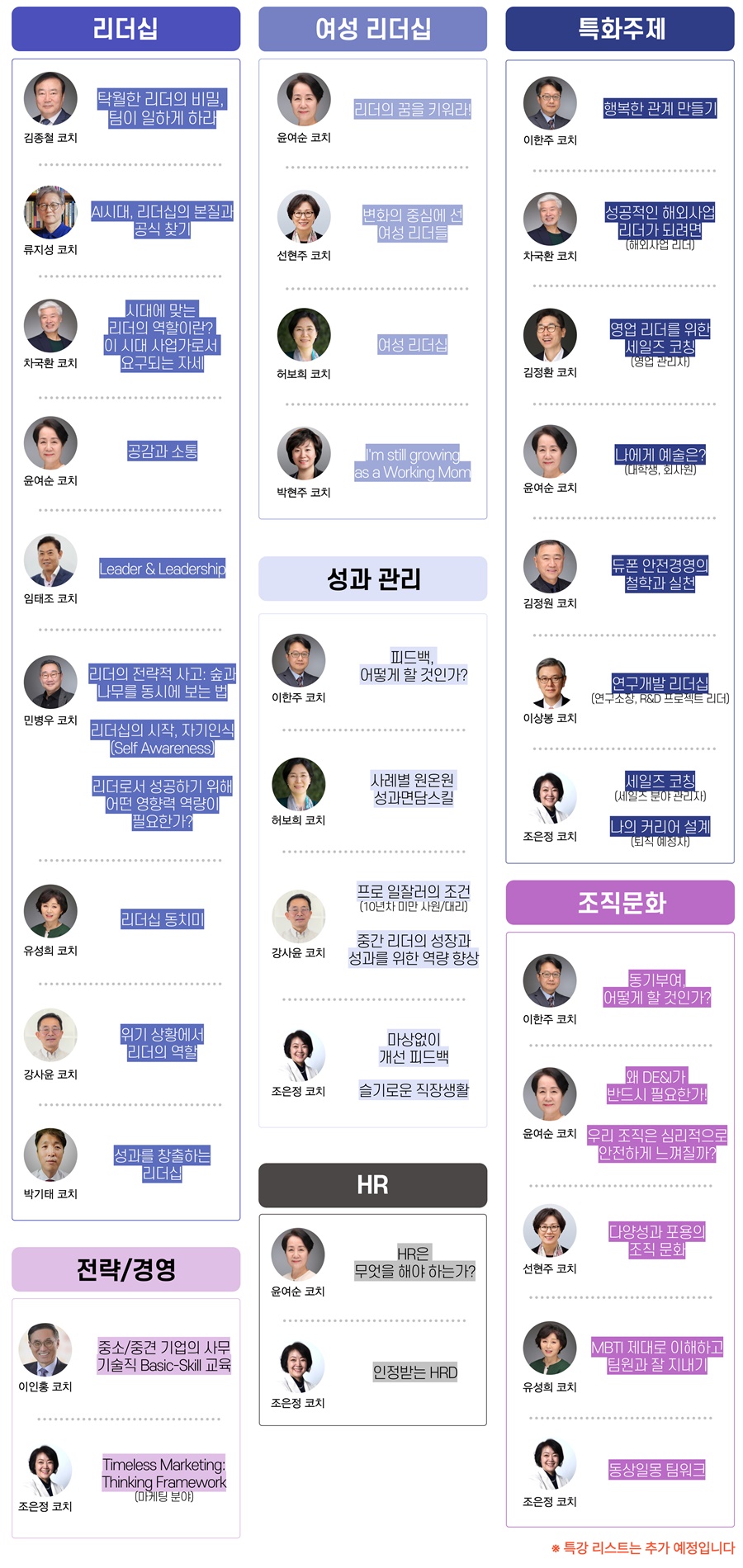 조직문화, 리더십, 성과관리부터 HR·세일즈·R&D 등 직무 특화 주제까지 변화의 시작을 함께합니다.