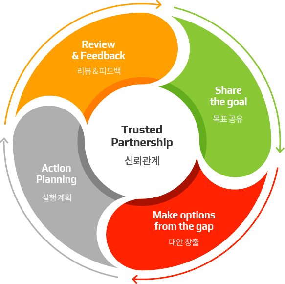 조직에서 함께 일하는 관계에서 상사(선배)가 부하(후배)를 코칭함으로써 성과 향상과 일을 통한 육성을 동시에 추구할 수 있습니다.